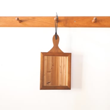 皮紐で調整して角度が変えられます。元の物はペグの径に合わせた丸穴が空いていて、そこをペグに掛けていました。これは、皮紐でつりさげていますが、シェーカー独自のユニークな鏡です。